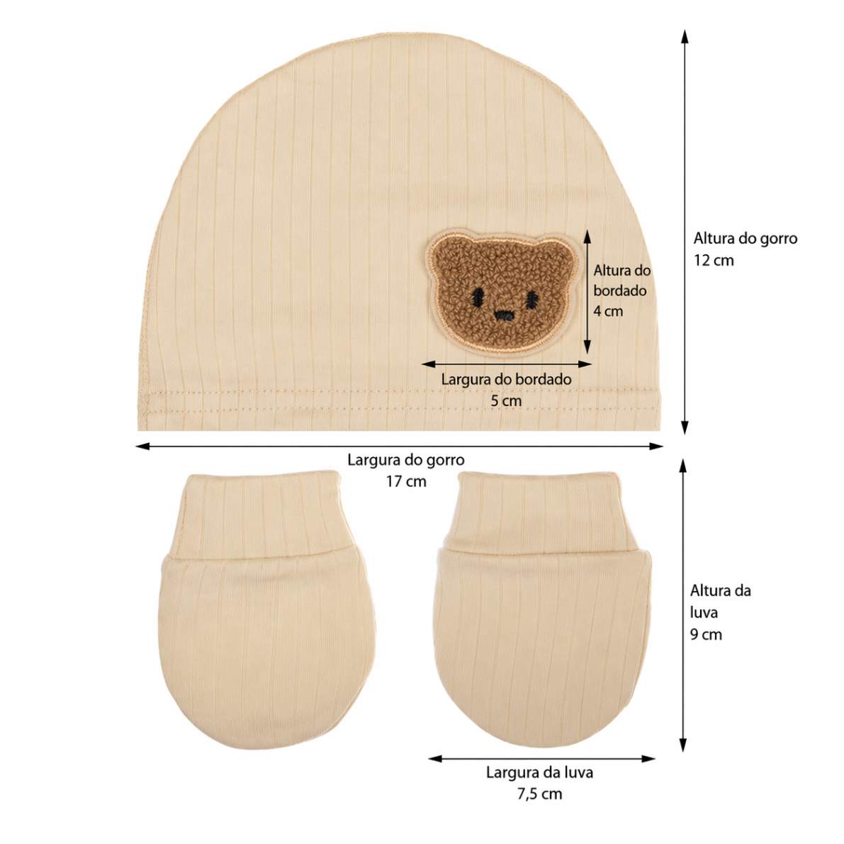 A touca mantém a cabecinha aquecida com suavidade, enquanto as luvinhas evitam arranhões e garantem conforto em todos os momentos — como um carinho constante, mesmo quando você não está por perto.